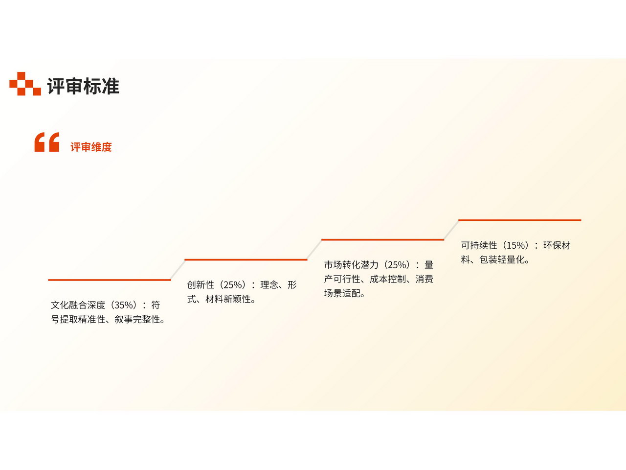 1.文化融合深度(35%):具有漳州地域特色,主题突出,对 “田园都市 文化名城” 主题的文化符号提取精准性、叙事完整性,以及融合自然与人文等文化元素的地域独特性 。